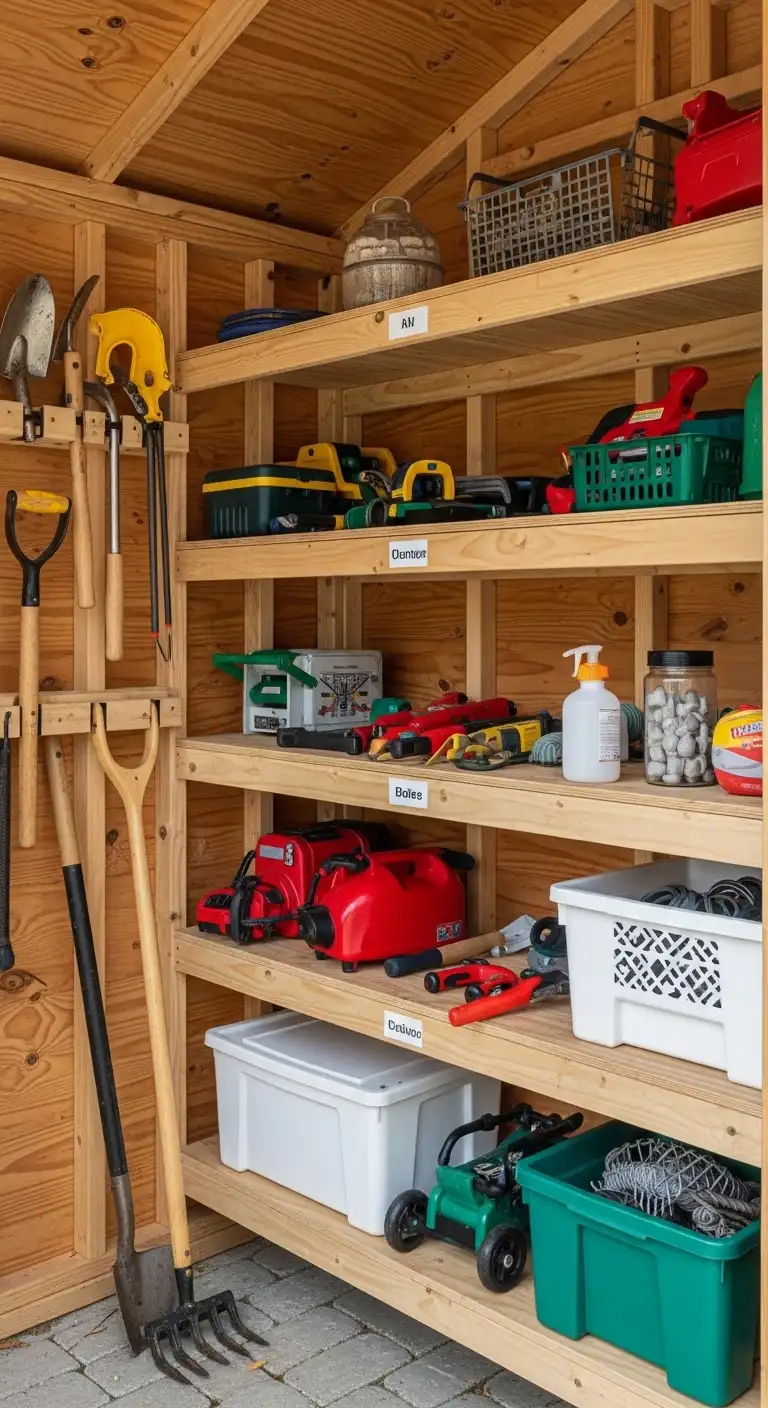 A multi-purpose diy garden shed uses clearly defined storage zones to improve organization and daily usability.