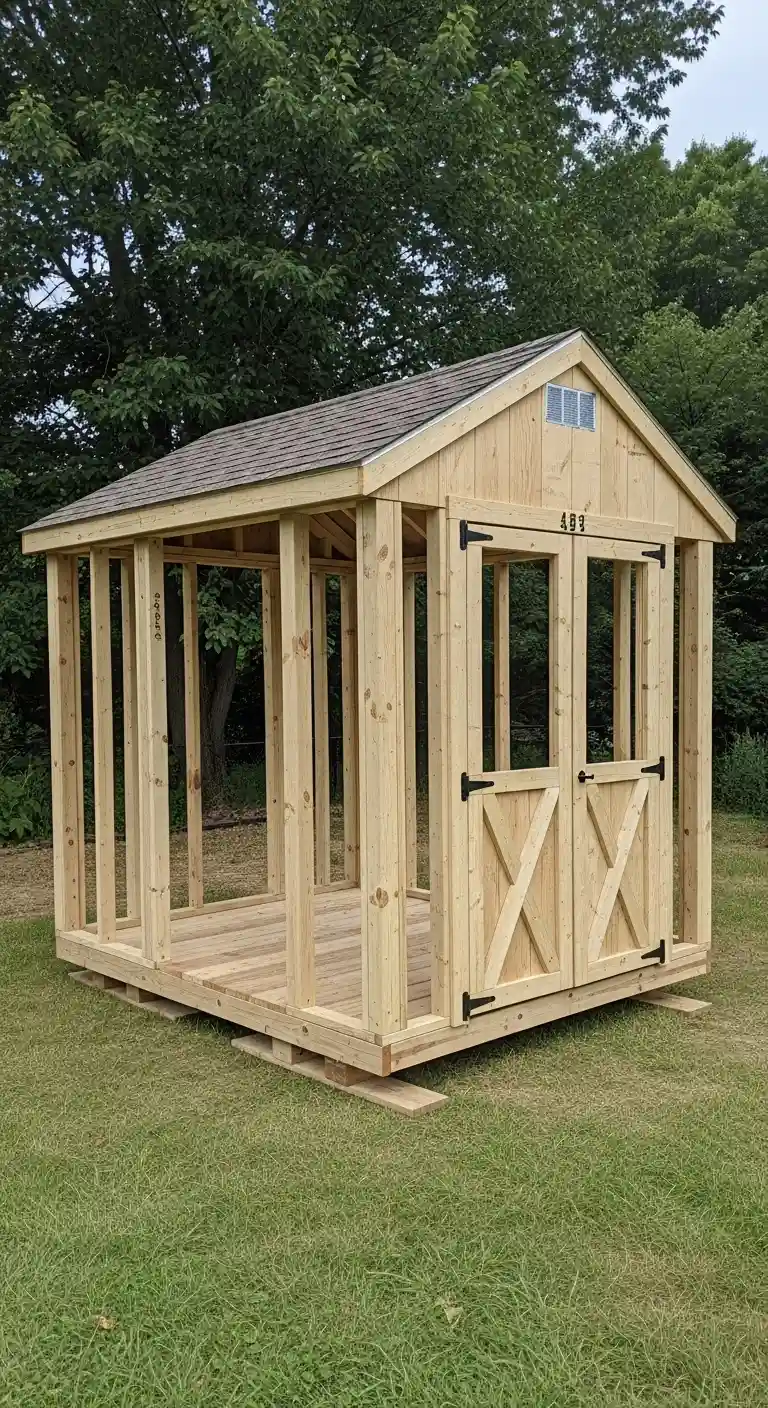 Simple wall framing and lightweight roofing materials keep construction manageable for beginners.