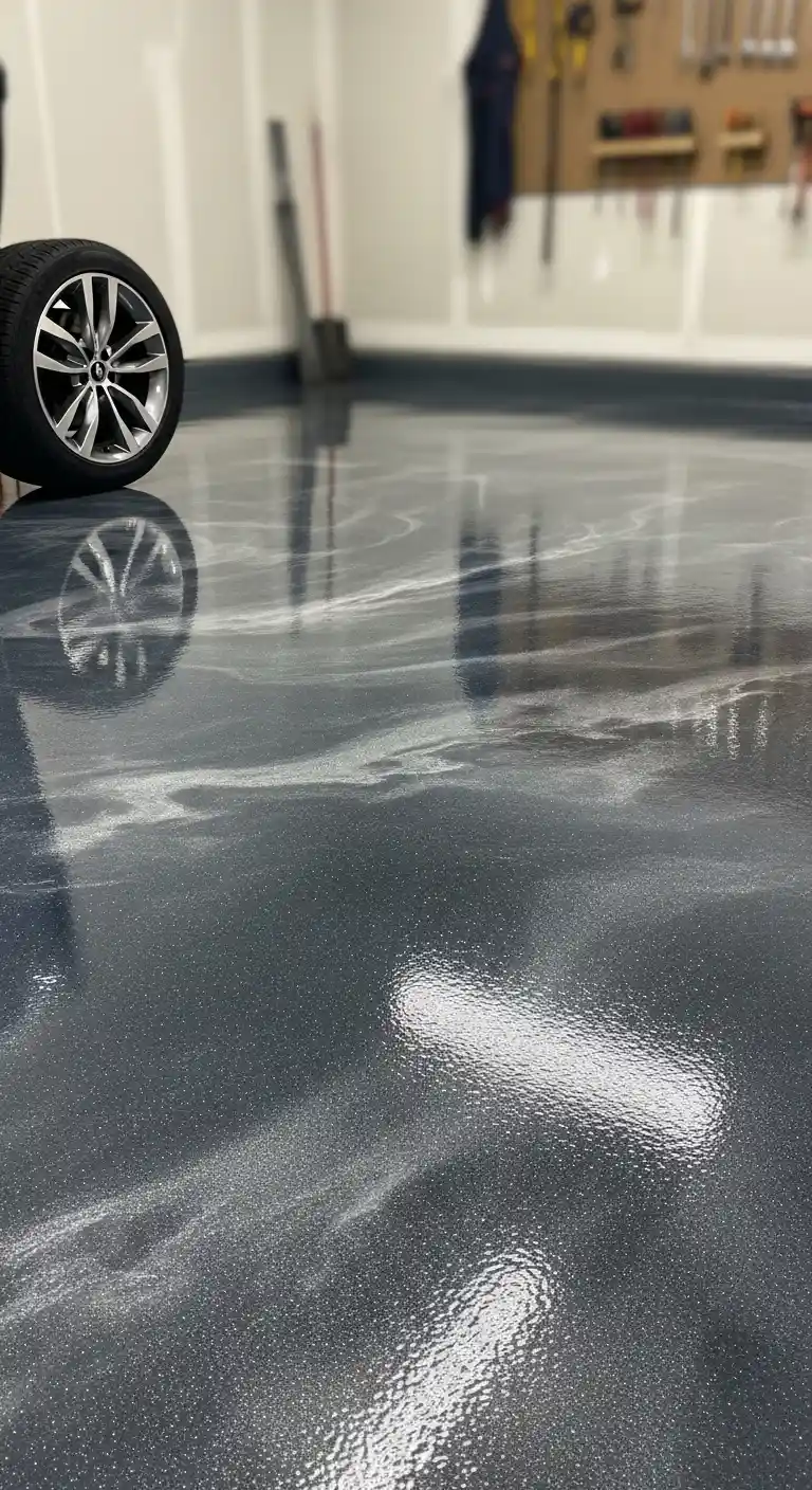 A metallic epoxy garage floor creates a glossy, marble-like surface that reflects light beautifully and gives the garage a premium, modern atmosphere.
